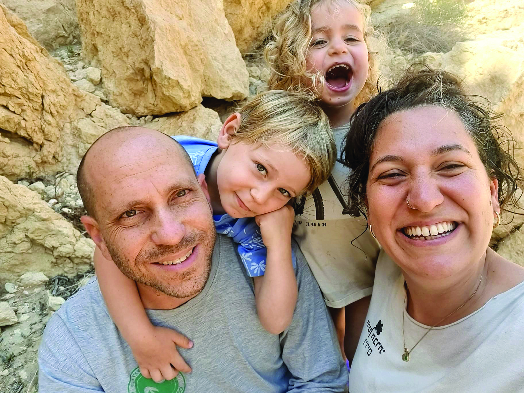 "ב-7 באוקטובר", היא מספרת, "היינו בממ"ד עם הבנים שלנו שהיו אז בני ארבע ושנתיים ועם גולי הכלב שלנו. ירון החזיק את הידית, כי היו שלוש פעמים ניסיונות כניסה ושוטטות בבית והיה פשוט פחד מוות, פשוטו כמשמעו".