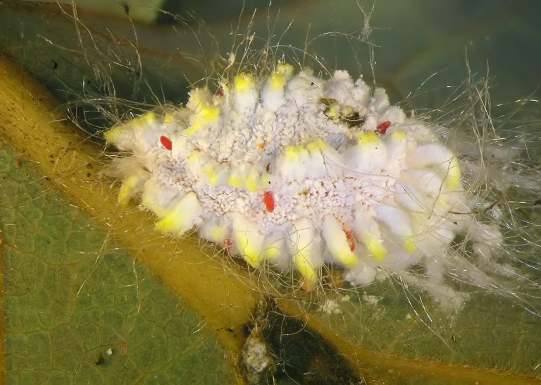 תמונה 4. מושית הרודוליה (Rodolia cardinalis): זחלים (מימין) ובוגרים (משמאל) טורפים איצריות סיישל בעלה אבוקדו.