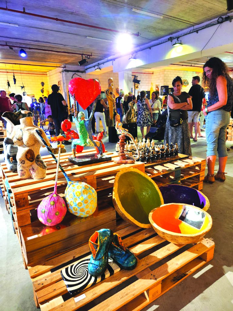 רבים מהמוצגים היו פרחוניים, מלאים בעלים בצבעוניות טבעית מקסימה. מישהו פיסל תמונת עיירה ממבט עילי; ציפורים, בלונים לאורך הקיר; בלונים פורחים הנראים כתלויים באוויר באמצע החלל. אפילו ג'ירפה ענקית, בצבעי ניאון, שלשונה קורצת החוצה. שפיריות דקות כנפיים, קיפודים, חתול לבוש כובע צמר וסוודר כחול, סט שחמט מלא ומפורט; זוג כלבים שנראים כעשויים מבלונים מנופחים בשלל צבעים; תפוח חצי אכול; פיל בעל חיטים עצומים, אבל רגליים דקיקות עליו יושב לוליין; "שמיחה"- שמיכה של שמחה ריאליסטית ומלאה בחיוכים; טווס שזנבו עשוי מדפים של ספר וחרוזים שזורים על ראשו ככתר ועוד.